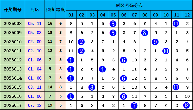 后区走势分析:上期开出07 12,开出和值19,较前一期和值上升12个点位变化,本期预测和值下降,参考号码03 06,和值9。