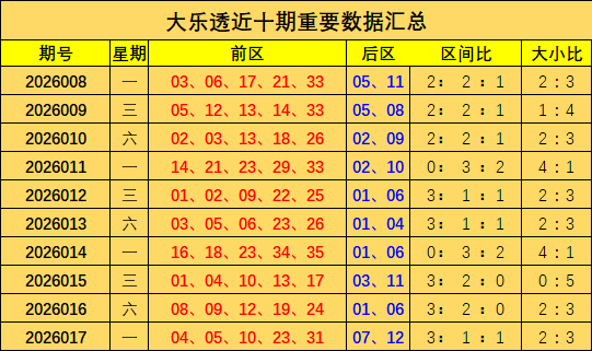 大乐透上期出奖号统计:前区04 05 10 23 31,后区07 12,三区比为3:1:1,大小比为2:3。