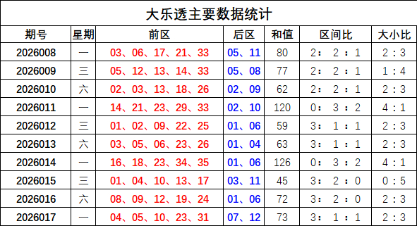 上期回顾:大乐透上期奖号为:前区04 05 10 23 31,后区07 12,前区奖号和值为73,区间比3:1:1,大小比为2:3,