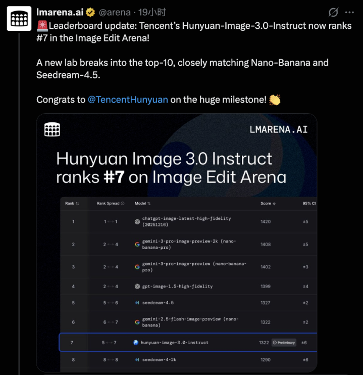 LMArena官方X祝贺混元图像3.0图生图模型:“图片编辑类别与Nano-Banana和Seedream-4.5等表现相当”。