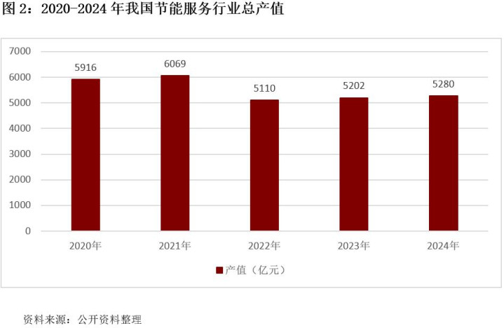 随着全球气候变化问题日益严峻和我国“双碳”战略的全面推进,节能技术服务公司作为绿色低碳转型的重要力量,正站在时代的风口。数据显示,中国已成为全球最大的节能服务市场,占全球份额约55%。根据中国节能协会发布数据,2016-2021年我国节能服务行业总产值由3567亿元增长至6069亿元,尽管2022-2023年受疫情和宏观经济环境影响,我国节能服务行业产值和增速出现下降,但在节能改造政策引导下,我国节能服务行业快速恢复活力。2023年我国节能服务产业总产值达5202亿元,同比增长1.80%,2024年我国节能服务产业总体稳中有进,产值达5280亿元,同比增长1.5%。