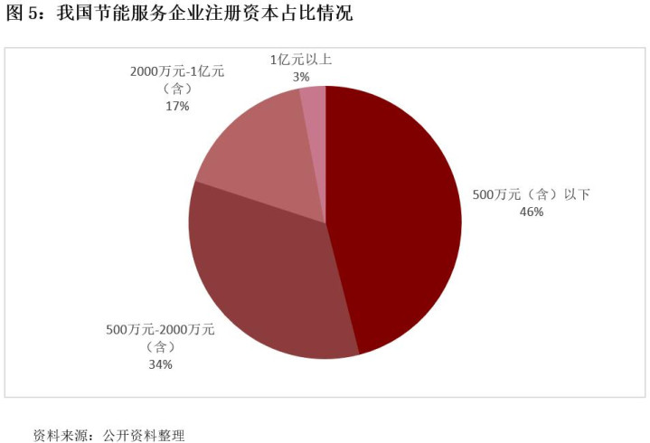 我国节能服务企业“数量大,体量小”特点鲜明,市场竞争压力较大。我国节能服务企业多数规模较小,其中注册资本在500万元以下的占比达46%,注册资金在500万元至2000万元之间的企业占比达34%,两者合计占比高达80%。