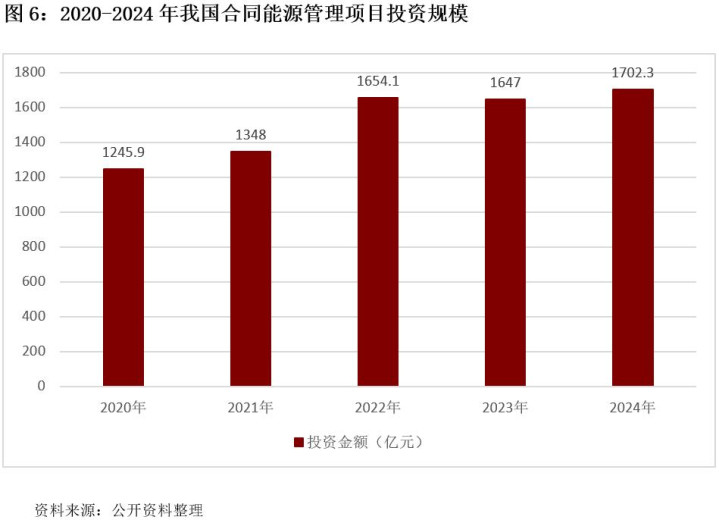 合同能源管理模式的本质是以减少的能源费用支付节能项目全部成本的投资方式,在美、加等发达国家已形成独立新兴产业。20世纪末该模式进入我国,在政府财政补贴、税收优惠等政策刺激支持下,合同能源管理项目投资从2016年约1074亿元增至2023年1647亿元,行业发展迅速。2024年我国合同能源管理投资增速为3.3%,投资强度约为3750元/tce,合同能源管理项目年投资规模创历史新高,达到1702.3亿元,这一良好态势背后,是政策与市场共同作用的结果。具体到细分行业的投资流向,新增投资流入最多的行业包括高耗能行业、公共设施等基建和数据中心等新基建。
