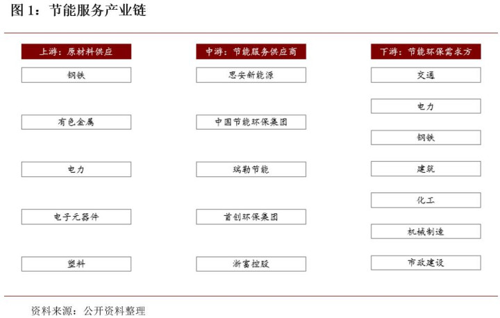 节能服务行业产业链上游包括钢铁、有色金属、电力、化工、电子元器件、塑料等在内的原材料供应商,这些行业节能服务产品的生产及工程实其价格波动直接影响供原材料,行业的利润产生影响。产业链中游为节能环保设备及服务供应商。产业链下游包括交通、电力、钢铁、建筑、化工、机械制造、市政建设等行业。