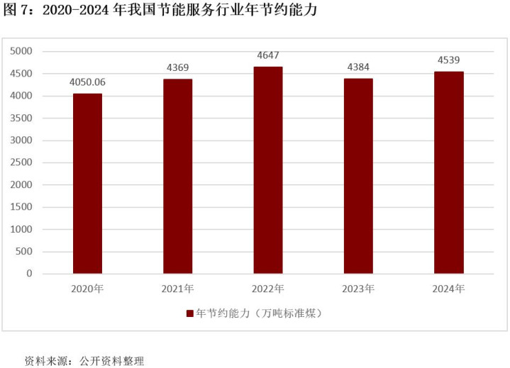 节能服务产业在节能、提效、降碳等方面作用日益凸显,助力雾霾治理与应对气候变化。随着行业快速发展,我国节能减排能力显著提升。2016-2023年,中国节能服务行业年节能能力从3579万吨标准煤增至4384万吨标准煤,2024年,合同能源管理项目新增投资形成的年节约能力为4539万吨标准煤,相当于减少11166万吨二氧化碳排放,节能减排能力总体稳定。