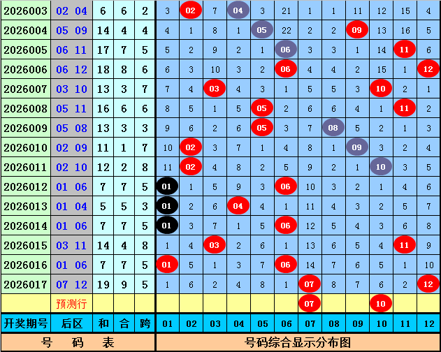 后区分析:上期后区开出号码07和12,最近10期后区奖号奇偶比为11:9,大小比为7:13,本期后区看好号码01、07、08、10、11,后区单挑两码07、10。