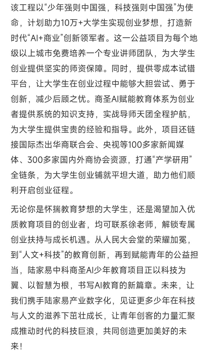 公益创业工程启航,赋能大学生筑梦未来在斩获殊荣、深耕教育的同时,陆家易产业数字化更积极肩负起社会责任,正式启动“陆家易中科商圣AI少年教育大学生创业工程”,以公益之心助力青年成长,为社会注入新的活力。