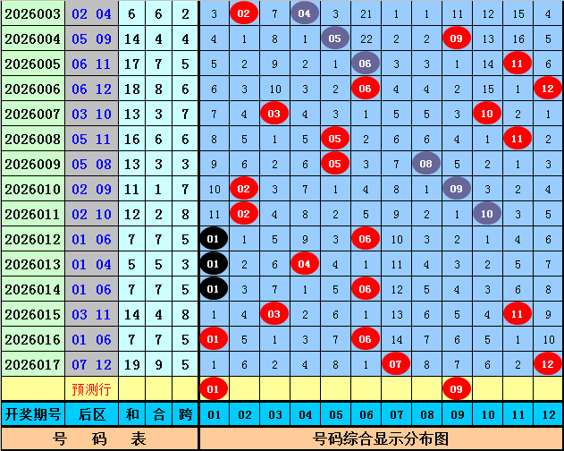 后区分析(一区01-04,二区05-08,三区09-12):上期后区开出奖号07和12,最近10期后区三区落号比为8:14:5,本期后区关注号码01、03、05、09、12,后区两码参考01、09。