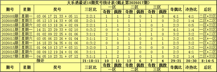 前区三区走势:上期前区奖号三区比为3:1:1,最近10期前区奖号三区比为21:18:11。